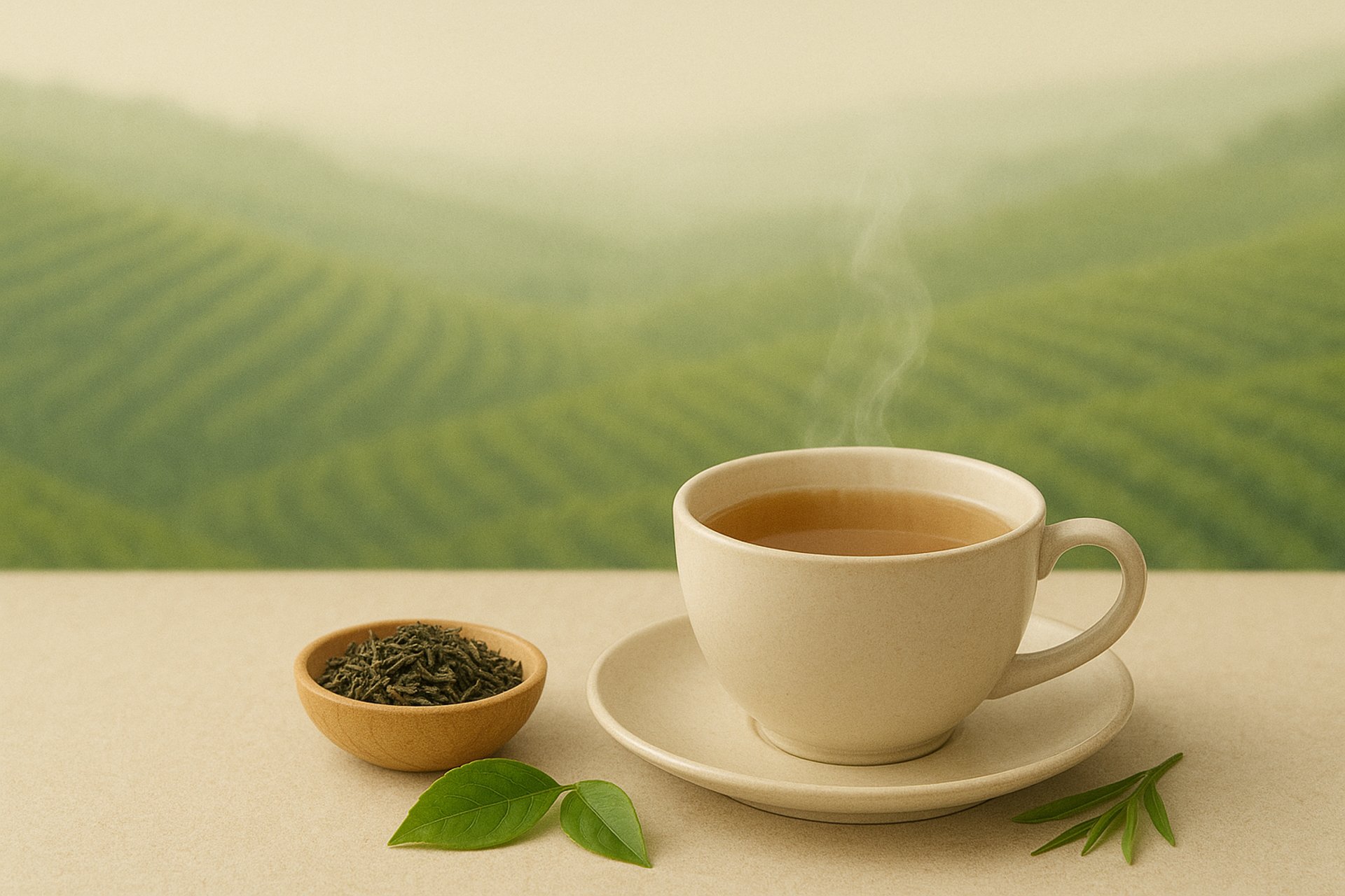 Fresh Tulsi leaves beside a clay or brass bowl of Tulsi powder or tea on a warm beige background, so